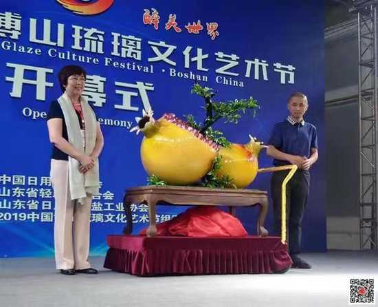 開(kāi)幕式上,孟令彥、鄭舞虹、畢榮青、王樹(shù)槐、王濟(jì)眾、劉忠遠(yuǎn)共同啟動(dòng)2019中國(guó)博山琉璃文化藝術(shù)節(jié)。中國(guó)日用玻璃協(xié)會(huì)向中國(guó)玻璃藝術(shù)大師孫奉柱授予“中國(guó)琉璃葫蘆孫”榮譽(yù)稱(chēng)號(hào);發(fā)布了2019中國(guó)博山琉璃文化藝術(shù)節(jié)標(biāo)志作品——世界最大的琉璃石榴;介紹了故宮與博山琉璃合作情況;發(fā)布了國(guó)家文化出口基地成果;淄博美陶瓷器有限公司與中科建集團(tuán)山家文旅(淄博)有限公司簽約;淄博愛(ài)美琉璃制造有限公司、淄博康乾琉璃藝術(shù)品制造有限公司與香港藝思公司聯(lián)合成立淄博博思琉璃制品有限公司(琉璃研發(fā)設(shè)計(jì)中心)揭牌;授權(quán)博山區(qū)有代表性的琉璃企業(yè)使用“博山琉璃”地理標(biāo)志。